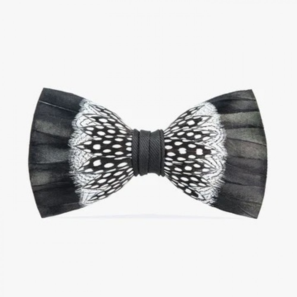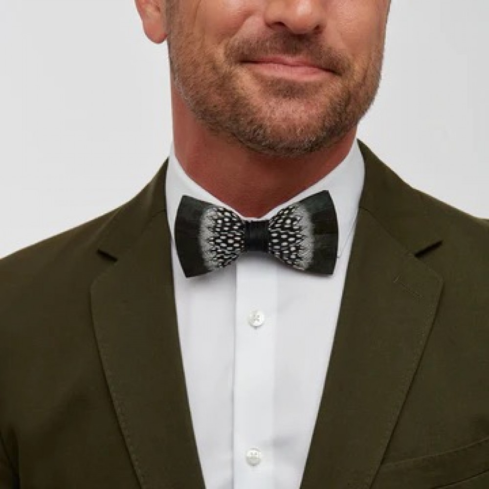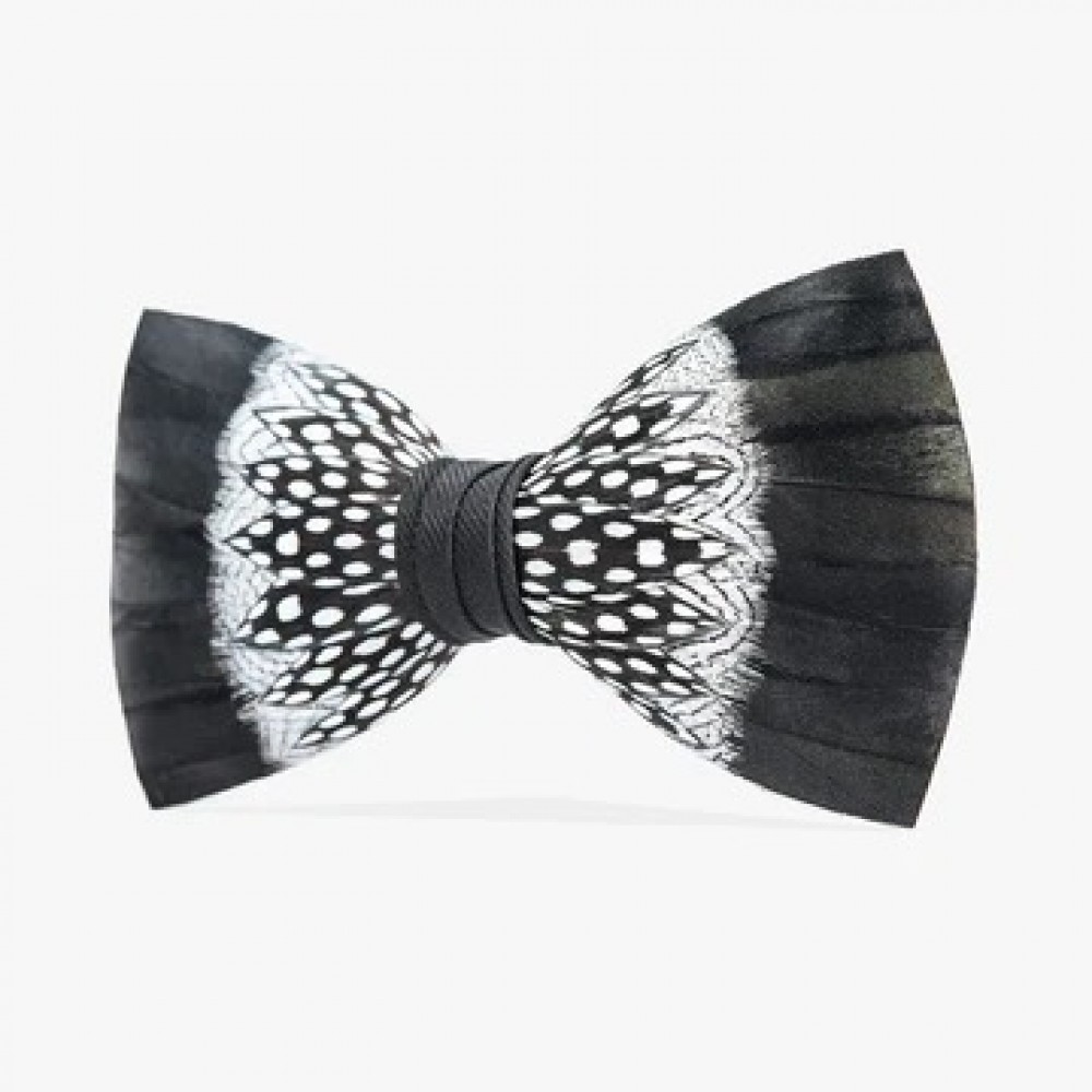 A best-selling black tie design, St. Pierre is crafted with slightly iridescent rooster feathers along the outer edge, with black and white pheasant and guinea feathers layered towards the center. Center wrap is black grosgrain.